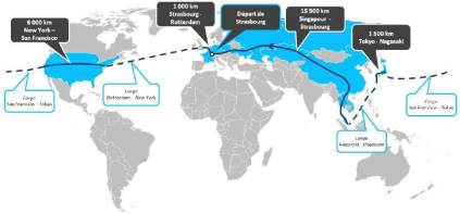 Lors de leur trajet de 25.000 km à travers 17 pays, les deux amis ont traversé les Etats-Unis de New York à San Francisco, puis le Japon, et enfin ont relié Singapour à Strasbourg via l'Asie du Sud-Est, la Chine, le Kazakhstan et l'Europe de l'Est.