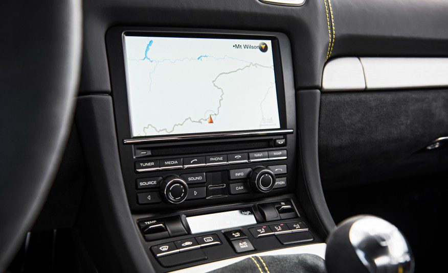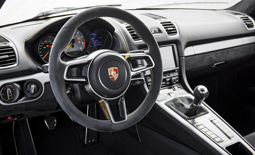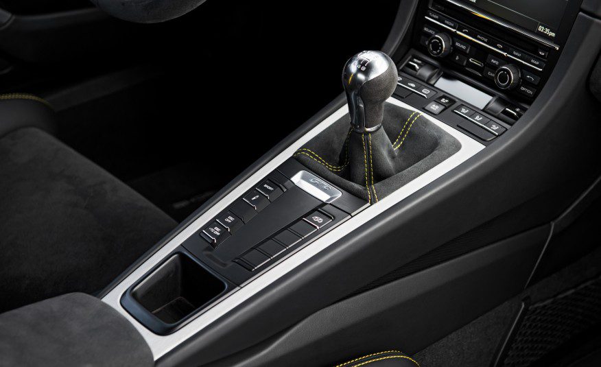 Vous êtes assis bas dans le GT4, en particulier avec les options (5000 €) des sièges monoblocs de la Spyder 918 ; impossible de monter ou de sortir normalement de la voiture. Entre les sièges, se trouve le levier court Porsche de la boite manuelle à six vitesses de Porsche qui fait claquer un passage de vitesse ridiculeusement rapide et facile. Appuyez sur le bouton de sport et le moteur adapte automatiquement la manette des gaz pour faire correspondre le régime moteur sur les rétrogradages. Il est difficile de rompre avec l'habitude du talon pointe pour rétrograder, mais l'ordinateur vous aide à trouver les bons régimes moteurs.