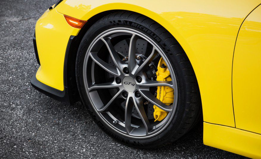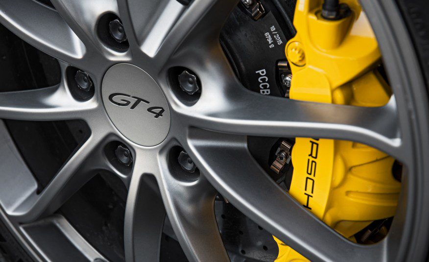 Quelques réglages subtils renforcent l'extrémité arrière et permettent un ajustement de carrossage, mais la plus grande différence entre la croupe du GT4 et celle des autres Cayman, se voit dans les pneus arrière repris de la 911. L'augmentation de la largeur des pneus avant n'est pas aussi importante que celle des pneus arrières et c'est peut être l'une des raisons pour lesquelles le GT4 sousvire plus que la Cayman GTS.