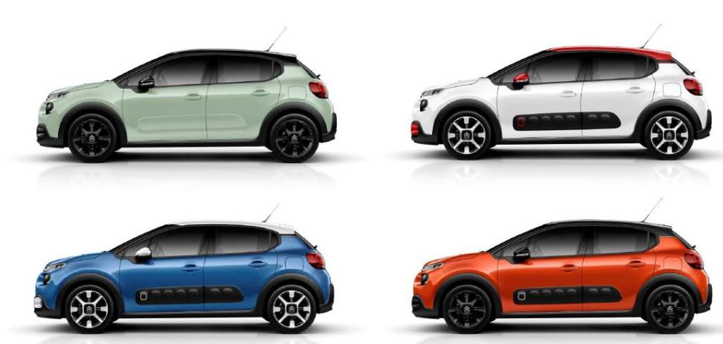 Le Client pourra configurer la couleur biton de sa C3. Il pourra choisir parmi 9 teintes de carrosserie : blanc banquise, noir perla, gris shark, gris aluminium, rouge rubis, almond green, cobalt blue, orange power, et sable. Les couleurs de toit sont : blanc opale, noir onix, rouge aden. Cela représente 36 combinaisons de couleur possibles.