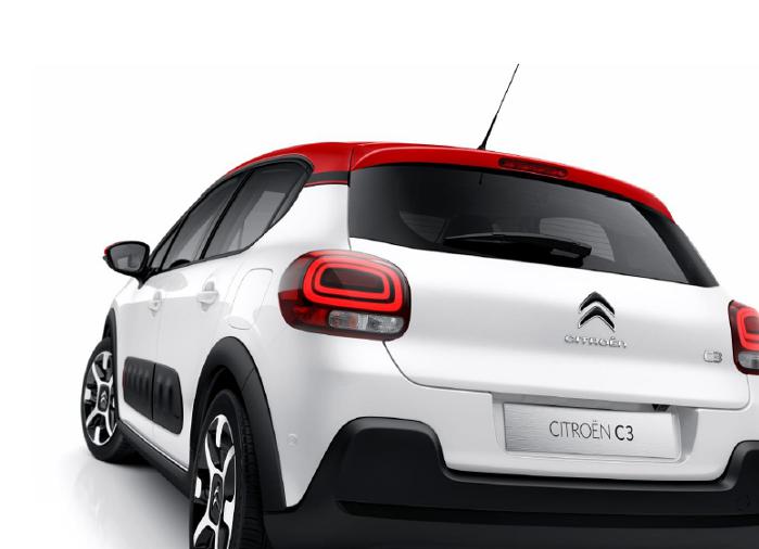 La face arrière de la nouvelle C3 met en avant la largeur de la voiture et souligne les feux arrières 3D. Le logo "C3" évolue et devient noir cerclé de chrome ce qui donne une connotation technologique à la voiture. Ce qui n'est pas sans rappeler les chevrons noirs cerclés de chrome adopté par le Citroën Cactus.
